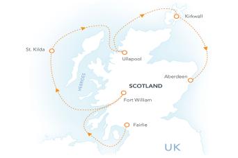 Day 1: All Aboard in Fairlie! Ocean Victory awaits our guests in the quaint harbor town of Fairlie, overlooking the sheltered waters of the Firth of Clyde, just a stone’s throw from the dynamic city of Glasgow. After mandatory safety briefings and drills, settle into your stateroom and toast your departure with an expertly crafted cocktail as Ocean Victory sets a course for the glassy lochs of the Highlands. Day 2: Fort William On the second day of our expedition, Ocean Victory arrives beneath the brooding mountains of the Nevis Range at the town of Fort William – Scotland’s adventure capital. Options to explore here are endless, from the famous crags of Glencoe to the heights of Ben Nevis, Britain’s highest mountain, and the storied shores of Loch Ness. Whether you are lacing up your hiking boots, grabbing your binoculars, or simply exploring the sights of the town – including the engineering marvel of Neptune’s Staircase – adventure awaits in every corner of Fort William. Day 3: St. Kilda Britain’s remotest archipelago, St. Kilda is Britain’s only dual UNESCO World Heritage Site, inscribed for both its human and natural wonders. We drop anchor in the bay overlooking the village – a unique settlement often compared to Machu Picchu, built entirely from stone by the islanders who once called this island home. Windswept, rugged, and difficult to farm, the locals of St. Kilda left for less challenging lands in 1930, leaving the island to vast seabird colonies and ancient Soay sheep, once the islanders’ primary source of food. Day 4: Ullapool Small, remote, and rarely visited, Ullapool is the largest town in the Northwest Highlands, a corner of Scotland with a population density closer to Mongolia than Britain. Ullapool sits on a long, calm loch surrounded by forests and mountains and is the gateway to the Northwest Highlands UNESCO Geopark. The ancient rocks here tell the story of billions of years of gradual evolution – encompassing the rise of life on Earth, the movement of continents, and impacts from space – creating a striking, otherworldly landscape of isolated mountains, rolling hills, and deep lochs. Explore on foot and step back millions of years with each step. Day 5: Kirkwall, Orkney The capital and largest town of the Orkney Islands, Kirkwall’s narrow streets beckon visitors to explore the town’s deep Scottish and Norse heritage. Highlights include the magnificent St. Magnus Cathedral and the Highland Park distillery, Scotland’s northernmost whisky producer. However, the islands’ history stretches back far beyond the medieval era to the Neolithic. Sites such as Skara Brae and the Ring of Brodgar are among the best preserved on Earth, bearing witness to 5,000 years of history and inscribed together as a UNESCO World Heritage Site – the Heart of Neolithic Orkney. Day 6: Aberdeen, Disembarkation On the final day of our expedition, Ocean Victory arrives in the heart of the Granite City. After a fond farewell to the officers and crew, step onto the granite streets of Scotland’s most important port city – the ideal place to head home with treasured memories of the glens, or to continue exploring the wonders of eastern Scotland