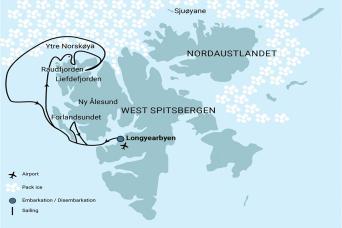 Voyage overview This expedition focuses on the versatility of North Spitsbergen’s visually stunning landscapes, vast spans of sea ice, and many opportunities to spot whales, polar bears, seabirds, walruses, and other such wildlife. Enjoy the fantastically beautiful landscapes, adventurous landings, and shoreline hikes. For additional activities, check the tour description. Day 1: Longyearbyen - Largest town, biggest island You touch down in Longyearbyen, the administrative center of Spitsbergen, the largest island of the Svalbard archipelago. Enjoy strolling around this former mining town, whose parish church and Svalbard Museum make for fascinating attractions. Though the countryside appears stark, more than a hundred species of plant have been recorded in it. In the early evening the ship sails out of Isfjorden, where you might spot the first minke whale of your voyage. Days 2-7: North Spitsbergen’s natural beauty, wildlife, and pack-ice This voyage will take you into the pack ice and along the remote shorelines of rugged north Spitsbergen. Places we might visit include the following: Raudfjord On the north coast of Spitsbergen, you can enjoy this expansive fjord spilling with glaciers – and maybe even visited by ringed and bearded seals. The cliffs and shoreline also support thriving seabird colonies, rich vegetation, and the possibility of polar bears. We will try to land at Alicehamna or Buchananhalvøya. Monaco Glacier Depending on the weather and sea ice, we could sail into Liefdefjorden, land at Texas Bar and cruise within sight of the 5-kilometer-long (3.1 miles) face of Monaco Glacier. The waters in front of this precipitous glacier are a favorite feeding spot for thousands of kittiwakes, and the base of the ice is a popular polar bear hunting ground. If ice conditions prevent us from sailing here early in the season, we may sail along the west coast of Spitsbergen. Highlights of Hinlopen We aim to sail into Hinlopen Strait, home to bearded seals, ringed seals, and polar bears. At the entrance, there is even the possibility to spot blue whales. After cruising among the ice floes of Lomfjord in the Zodiacs, you can view the bird cliffs of Alkefjellet, with their thousands of Brünnich’s guillemots. On the east side of Hinlopen Strait, we may attempt a landing on Nordaustlandet. Here we may see reindeer, pink-footed geese, and walruses. We can take an alternate route if ice prevents entry into Hinlopen. The Seven Islands The northernmost point of the voyage may be north of Nordaustlandet at Chermsideøya or Phippsøya, in the Seven Islands. Here we may reach 80° north, just 870 km (540 miles) from the geographic North Pole. Polar bears inhabit this region, so the ship may park for several hours among the pack ice before wheeling around west again. Sailing the continental shelf While retracing our route west, keep watch for polar bears and elusive Greenland (bowhead) whales. About 40 nautical miles west of Spitsbergen, we sail the edge of the continental shelf. Here fin whales forage during the summer in the upwelling zones (where cold, nutrient-rich water wells up from below the sea’s surface) that run along the Spitsbergen banks. At the mouth of Kongsfjorden, you have a good chance of sighting minke whales. Forlandsundet, St. Johns Fjord, or Alkhornet Walruses sometimes haul out in Forlandsundet at Sarstangen or Poolepynten. Alternatively, we might sail into St. Johns Fjord or south to the mouth of Isfjorden, landing at Alkhornet. Seabirds nest on these cliffs, Arctic foxes search below for fallen eggs and chicks, and reindeer graze the sparse vegetation. Day 8: Longyearbyen - There and back again Even great adventures must eventually come to an end. The vessel arrives back in Longyearbyen in the early morning, and bus transportation to the airport will be provided. PLEASE NOTE: All itineraries are for guidance only. Programs may vary depending on ice, weather, and wildlife conditions. Landings are subject to site availabilities, permissions, and environmental concerns per AECO regulations. Official sailing plans and landing slots are scheduled with AECO prior to the start of the season, but the expedition leader determines the final plan. Flexibility is paramount for expedition cruises. The average cruising speed of our vessel is 10.5 knots.Scrolling is disabled on map, please click to enable.