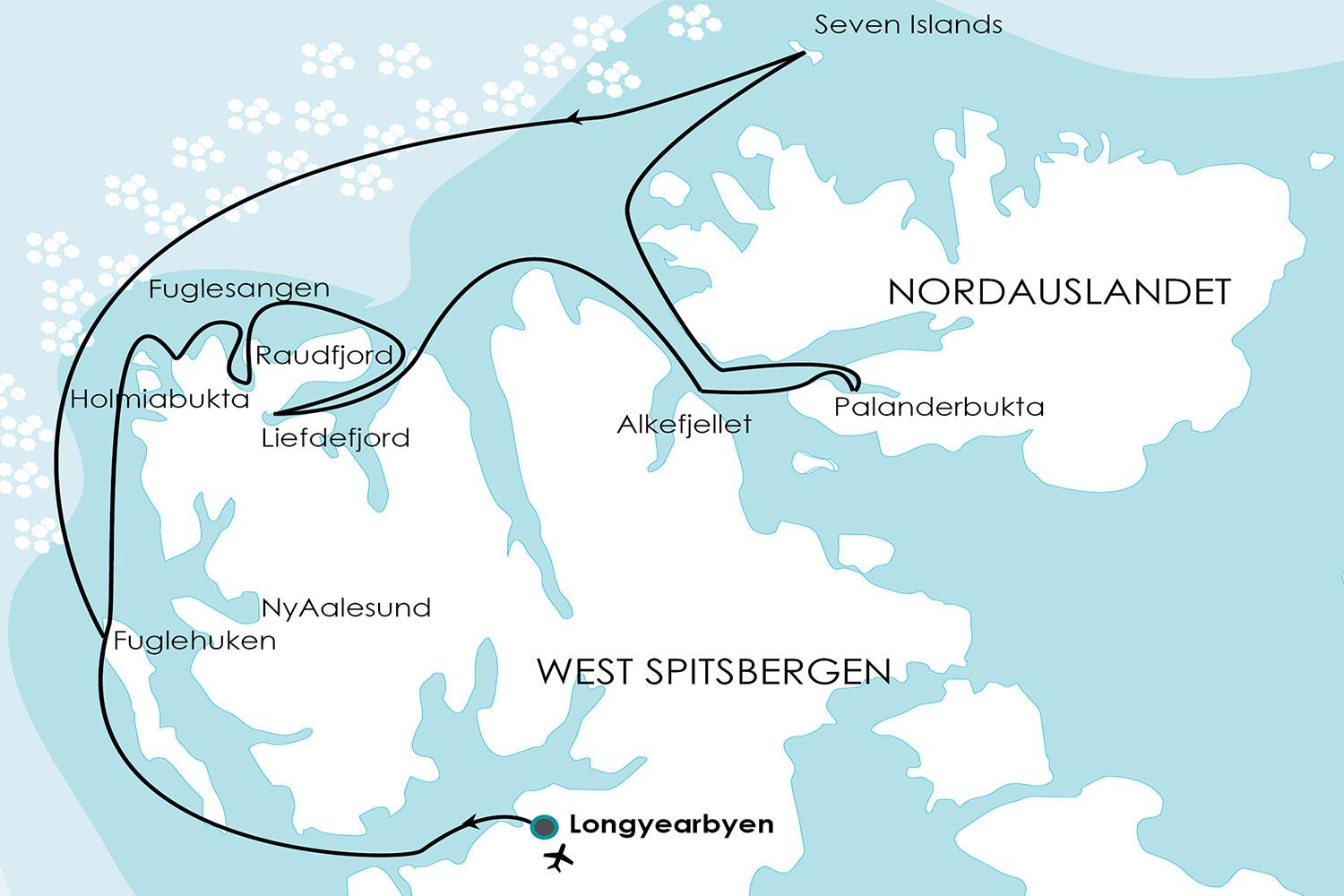 Voyage Overview This expedition focuses on the pack ice of north Spitsbergen and many opportunities to spot whales, polar bears, seabirds, walruses, and other such wildlife. Day 1: Longyearbyen - Largest town, biggest island You touch down in Longyearbyen, the administrative center of Spitsbergen, the largest island of the Svalbard archipelago. Enjoy strolling around this former mining town, whose parish church and Svalbard Museum make for fascinating attractions. Though the countryside appears stark, more than a hundred species of plant have been recorded in it. In the early evening the ship sails out of Isfjorden, where you might spot the first minke whale of your voyage.Day 2-7: North Spitsbergen’s natural beauty, wildlife, and multi-day pack-iceThis voyage will take you into the pack ice and along the remote shorelines of rugged north Spitsbergen. Places we might visit include the following: Raudfjord On the north coast of Spitsbergen, you can enjoy this expansive fjord spilling with glaciers – and maybe even visited by ringed and bearded seals. The cliffs and shoreline also support thriving seabird colonies, rich vegetation, and the possibility of polar bears. We will try to land at Alicehamna or Buchananhalvøya. Monaco Glacier Depending on the weather and sea ice, we could sail into Liefdefjorden, land at Texas Bar and cruise within sight of the 5-kilometer-long (3.1 miles) face of Monaco Glacier. The waters in front of this precipitous glacier are a favorite feeding spot for thousands of kittiwakes, and the base of the ice is a popular polar bear hunting ground. If ice conditions prevent us from sailing here early in the season, we may sail along the west coast of Spitsbergen. The Seven Islands The northernmost point of the voyage may be north of Nordaustlandet, in the Seven Islands. Here we may reach 80° north, just 870 km (540 miles) from the geographic North Pole. At Phippsøya there is a walrus haul-out site, while Rossøya is the northernmost landmass in Spitsbergen. The vessel may sail deeper into the pack ice when wheeling around west again. Sailing in the pack ice We aim to sail into the pack ice at quite some distance from the coast of Spitsbergen, watching for polar bears and other animals at the edges of the pack. Our voyage through the pack ice may be a multi-day affair, depending on the position of the ice and local sea and weather conditions. Regardless of how long we spend in the ice, these days at sea will be a highlight of the trip. Note that while the ship navigates the pack ice, we will not make any shore landings or excursions from the ship. However, wildlife encounters are the main draw here, with good chances to encounter many species that thrive in this icy habitat, including polar bears, seals, and whales. After our time on the ice, we will retrace our route west, keeping watch for polar bears, ringed seals, and elusive Greenland (bowhead) whales. This is also the habitat of ivory gulls. About 40 nautical miles (74 km) west of Spitsbergen, we will sail along the edge of the continental shelf. Here, fin whales forage during the summer in the upwelling zones (where cold, nutrient-rich water wells up from below the sea’s surface) that run along the Spitsbergen banks. At the mouth of Kongsfjorden, you will have a good chance of sighting minke whales. Forlandsundet wildlife Walruses sometimes haul out in Forlandsundet, at Poolepynten. But if we cannot go there, we might sail to the mouth of Isfjorden, where we may see different species of rorqual whales. Our intended landing site is Alkhornet, where seabirds nest on the cliffs, Arctic foxes search below for fallen eggs and chicks, and reindeer graze the sparse vegetation. Another possibility is the glacier front in Ymerbukta, where you can see congregations of various eider duck species. Day 8: Longyearbyen - There and back again Even great adventures must eventually come to an end. The vessel arrives back in Longyearbyen in the early morning, and bus transportation to the airport will be provided. PLEASE NOTE: All itineraries are for guidance only. Programs may vary depending on ice, weather, and wildlife conditions. Landings are subject to site availabilities, permissions, and environmental concerns per AECO regulations. Official sailing plans and landing slots are scheduled with AECO prior to the start of the season, but the expedition leader determines the final plan. Flexibility is paramount for expedition cruises. The average cruising speed of our vessel is 10.5 knots.Scrolling is disabled on map, please click to enable.