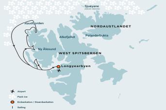 Voyage overview This expedition focuses on the versatility of north Spitsbergen’s visually stunning landscapes, vast spans of sea ice, and many opportunities to spot whales, polar bears, seabirds, walruses, and other such wildlife. Enjoy the fantastically beautiful landscapes, adventurous landings, and shoreline hikes. For additional activities, check the tour description. Day 1: Largest town, biggest island You touch down in Longyearbyen, the administrative center of Spitsbergen, the largest island of the Svalbard archipelago. Enjoy strolling around this former mining town, whose parish church and Svalbard Museum make for fascinating attractions. Though the countryside appears stark, more than a hundred species of plant have been recorded in it. In the early evening the ship sails out of Isfjorden, where you might spot the first minke whale of your voyage. Days 2-7: North Spitsbergen’s natural beauty, wildlife, and pack-ice This voyage will take you into the pack ice and along the remote shorelines of rugged north Spitsbergen. Places we might visit include the following: Raudfjord On the north coast of Spitsbergen, you can enjoy this expansive fjord spilling with glaciers – and maybe even visited by ringed and bearded seals. The cliffs and shoreline also support thriving seabird colonies, rich vegetation, and the possibility of polar bears. We will try to land at Alicehamna or Buchananhalvøya. Monaco Glacier Depending on the weather and sea ice, we could sail into Liefdefjorden, land at Texas Bar and cruise within sight of the 5-kilometer-long (3.1 miles) face of Monaco Glacier. The waters in front of this precipitous glacier are a favorite feeding spot for thousands of kittiwakes, and the base of the ice is a popular polar bear hunting ground. If ice conditions prevent us from sailing here early in the season, we may sail along the west coast of Spitsbergen. Highlights of Hinlopen We aim to sail into Hinlopen Strait, home to bearded seals, ringed seals, and polar bears. At the entrance, there is even the possibility to spot blue whales. After cruising among the ice floes of Lomfjord in the Zodiacs, you can view the bird cliffs of Alkefjellet, with their thousands of Brünnich’s guillemots. On the east side of Hinlopen Strait, we may attempt a landing on Nordaustlandet. Here we may see reindeer, pink-footed geese, and walruses. We can take an alternate route if ice prevents entry into Hinlopen. The Seven Islands The northernmost point of the voyage may be north of Nordaustlandet at Chermsideøya or Phippsøya, in the Seven Islands. Here we may reach 80° north, just 870 km (540 miles) from the geographic North Pole. Polar bears inhabit this region, so the ship may park for several hours among the pack ice before wheeling around west again. Sailing the continental shelf While retracing our route west, keep watch for polar bears and elusive Greenland (bowhead) whales. About 40 nautical miles west of Spitsbergen, we sail the edge of the continental shelf. Here fin whales forage during the summer in the upwelling zones (where cold, nutrient-rich water wells up from below the sea’s surface) that run along the Spitsbergen banks. At the mouth of Kongsfjorden, you have a good chance of sighting minke whales. Forlandsundet, St. Johns Fjord, or Alkhornet Walruses sometimes haul out in Forlandsundet at Sarstangen or Poolepynten. Alternatively, we might sail into St. Johns Fjord or south to the mouth of Isfjorden, landing at Alkhornet. Seabirds nest on these cliffs, Arctic foxes search below for fallen eggs and chicks, and reindeer graze the sparse vegetation. Day 8: Longyearbyen - There and back again Even great adventures must eventually come to an end. The vessel arrives back in Longyearbyen in the early morning, and bus transportation to the airport will be provided. PLEASE NOTE: All itineraries are for guidance only. Programs may vary depending on ice, weather, and wildlife conditions. Landings are subject to site availabilities, permissions, and environmental concerns per AECO regulations. Official sailing plans and landing slots are scheduled with AECO prior to the start of the season, but the expedition leader determines the final plan. Flexibility is paramount for expedition cruises. The average cruising speed of our vessel is 10.5 knots.Scrolling is disabled on map, please click to enable.