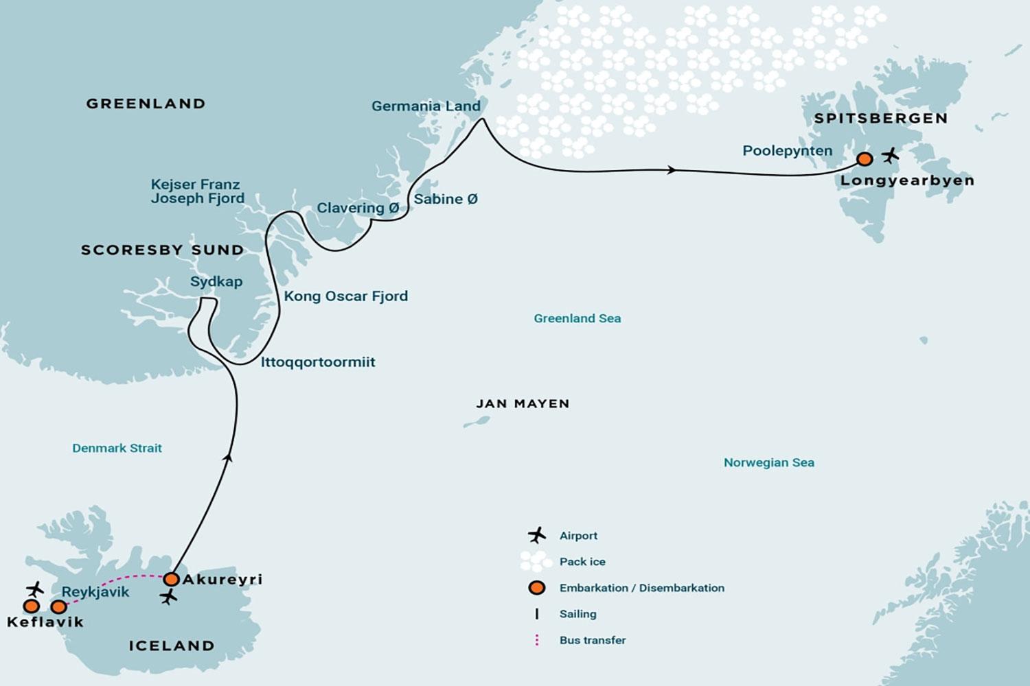 Day 1: Akureyri, Iceland Your journey begins in the morning. By request, you can transfer via chartered bus (T) from bus stop Harpa Concert Hall and Conference Centre at Austurbakki, Reykjavik (the meeting point) to the ship in Akureyri (the embarkation point). You arrive in the afternoon after a six-hour drive through northern Iceland. PLEASE NOTE: This transfer (T) must be booked and paid for in advance. In the early evening, the ship departs from the port of Akureyri, where, we often see whales at the mouth of the fjord. At night, we cross the Arctic Circle. Day 2: Sailing to East Greenland While sailing north, you’re likely to see fulmars, kittiwakes, gannets, common guillemots, and possibly whales. By evening, the first icebergs flash into sight as you approach the east Greenland coast near Kap Brewster. The scent of adventure is in the air. Day 3: Arriving at Earth’s largest fjord Today, you reach Scoresby Sund, sailing along the glaciated Volquart Boons Kyst. You may also enjoy a Zodiac cruise past one of the glacier fronts, along with a visit to the basalt columns and ice formations of Vikingebugt. In the afternoon, we plan to sail by the east coast of Milne Land among a multitude of giant icebergs. If we can also land at Charcot Havn, we may walk to the Charcot Glacier. We will then continue by Bjørneøer, a small group of islands – Bear Islands in English. Day 4: Enormous icebergs & Arctic hares In the morning, you will likely encounter colossal icebergs, some over 100 meters (328 feet) high and more than a kilometer (.62 mile) long. Most are grounded, as the fjord is only about 400 meters deep (1,312 feet). You then land near Sydkap, with fine views of Hall Bredning and a good shot of seeing Arctic hares. Today’s long walk goes from Sydkap to Nordøstbugt (12 km, 7.5 miles to the northeast), where the river coming from Holger Danskes Briller flows into the sea. We plan to walk south along the shore to Satakajik, seeing whale vertebrae and the remains of Thule summer houses. Passengers who opt out of the long walking group will join us at this location for their second excursion of the day. Day 5: Landfall at Ittoqqortoormiit The morning stop is at Ittoqqortoormiit, the only settlement in Scoresby Sund with about four hundred inhabitants. At the post office, you can buy stamps for your postcards or just stroll around to see the sled dogs and drying skins of seals, polar bears, and musk oxen. In the afternoon, you sail north, passing the picturesque landscapes of Liverpool Land. In the night, we sail into Kong Oscar Fjord. Day 6: Alpefjord’s lofty peaks Today, you will enter Segelsällskapets Fjord, with the striped slopes of the Berzelius Mountains bordering the north side. You will land on the south shore, where ancient sedimentary formations lie at your feet. A hike takes you near a small lake with good chances to see musk oxen, Arctic hares, and ptarmigans. Alternatively, the ship ventures into Alpefjord, which is aptly named for the spire-like peaks that thrust up around it. You may then embark on a Zodiac cruise around Gully Glacier, which once blocked access to the interior of these waters. Continuing deep into the fjord, you experience a definitive Greenland adventure. Day 7: The islands of Antarctic Sound In the early morning, you pass by the islands of Ruth, Maria, and Ella. Then you arrive at Teufelschloss (Devil’s Castle), a mountain with impressive layered geology. Blomsterbugt and the intended landing site are on the other side of the fjord. In the afternoon, you sail, among icebergs, through the majestic Kaiser Franz Joseph Fjord and Mackenzie Bugt. Day 8: Remains of Thule Culture at Eskimonaes We hope to land at Eskimonaes on the southern shore of Clavering Ø, where Douglas Clavering met a small group of Thule culture people in 1823. This group represents the only living Thule people ever seen in Northeast Greenland. The remains of their existence can be found across Greenland. Day 9: Islands with polar history From early in the morning until late in the day, we sail by a choice of islands, where more than a century ago, the first polar expeditions set feet on land: Sabine Ø and Bass Rock (Pendulum Islands), where Edward Sabine did his Pendulum experiments in 1823, and cabins built by the Baldwin-Ziegler Polar Expedition were constructed. In the night, we will pass Shannon Ø. Day 10: Store Koldewey This long island was named by the second German Polar Expedition of Koldewey 1869 –’70. We will try to land on historical Kap Alf Trolle or Kap Ahrend. We are now well into the High Arctic climate regime. The landscape is getting lower and rounded, being much less alpine than more to the south. We may encounter heavier sea ice streaming south. Proposed landing sites may be given up due to sea ice, and others may be reachable. Day 11: Germania Land Today, we could land at Thoms Thomsen Naes, Fyrretyvekilometersnaesset, or another site in Germania Land, an area with musk oxen and sometimes a lonely wolf. The landing sites depend on ice and weather conditions and wildlife opportunities. Day 12: Through or around the sea ice When sailing eastward through and along the jagged edge of the Northeast Greenland sea ice, we keep watch for whales, seals, polar bears, and migrating seabirds. This is a landscape of constant change, and a real frontier for many species found in the Arctic. Day 13: Approaching Spitsbergen At open sea now, we sail eastward in the northernmost branch of the warm Gulf Stream toward Spitsbergen. If time allows, we may land late in the day at the walrus haul-out at Poolepynten. Day 14: Longyearbyen In Longyearbyen, the administrative center of Spitsbergen, you may enjoy strolling around this former mining town, whose parish church and Svalbard Museum are fascinating attractions. Alternatively, you can board the first plane to Oslo for your onward journey. PLEASE NOTE: The probability of sailing into Scoresby Sund is high (based on expe