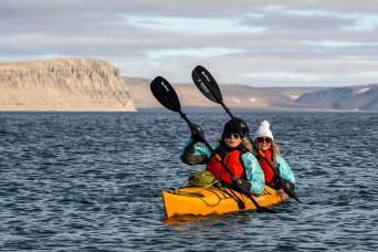 Selected departures may include an option for Sea Kayaking – contact us for availability! Sea kayaking on a polar expedition brings you face-to-face with the polar wilderness from a unique, water-level vantage. Glide silently among icebergs and beside glaciers, drift past curious birds or seals, and explore remote fjords and coastline not accessible by ships. Kayaking becomes a deeply immersive, sensory experience—crisp air, icy water, wildlife calls and the hush of untouched nature. Guided by expert polar staff, you paddle safely in small groups, often with Zodiac support close by. Whether you choose a single paddle outing or a full kayak program, this adventure gives you an intimate connection with polar landscapes few ever experience. >>Read More Details on this information page!
