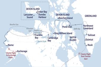 Day 1 Arrive in Toronto Having made your way to Toronto Airport, check-in at our group hotel located near the airport for an overnight stay. Please visit the hospitality desk to collect your luggage cabin tags and to speak with our ground operations team, who may have information to share with you about pre-embarkation procedures and the charter flight to Nuuk tomorrow. You will receive cabin tags for your luggage. Please clearly label the tags with your name and ship cabin number. Accommodation: Westin Toronto Airport Hotel Day 2 Fly to Nuuk, embarkation This morning, please ensure your cabin luggage is fitted with cabin tags clearly labelled with your name and cabin number. Enjoy breakfast at the hotel before transferring to the airport for our charter flight to Nuuk for embarkation. Any valuables or personal items should be kept on you throughout the day. After boarding, there is time to settle into your cabin before our important safety briefings. This evening, meet your expedition team and crew at the Captain’s Welcome Drinks. Day 3 Sisimiut Greenland’s second largest town, Sisimiut is located approximately 54 kilometres (33.5 miles) north of the Arctic Circle, meaning that during summer, you can experience the midnight sun here. The town is famous for the old blue church with the gate made of whale bone. In the cosy museum next door to the church, you will find an excellent reconstruction of an Inuit turf house as well as exhibits of local history and early life in Greenland. Sisimiut offers hiking trails with various degrees of difficulty. The easier trails take you through the town itself, its outskirts and into the mountains, where you will find spectacular vantage points. Approximately 4,500 years ago, the Saqqaq culture arrived from Canada and settled in the area. They lived here for approximately 2,000 years, after which they mysteriously disappeared from the area. The Dorset culture arrived around 500 CE and stayed until the 1200s until they were replaced by the Thule culture, and today, most of the population of Sisimiut are descendants of the Thule culture. Day 4 Ilulissat In the afternoon we arrive in Ilulissat. Known as the ‘birthplace of icebergs’, this region produces some of the most dazzling icebergs found anywhere in the Arctic. Hike past the husky sledge dogs to the UNESCO World Heritage-listed Icefjord and stand in awe at its immensity. Sermeq Kujalleq, also known as Jakobshavn Glacier, is the most productive glacier – not only in Greenland but the entire Northern Hemisphere. It produces 20 million tonnes of ice each day, all floating into the Ilulissat Icefjord and Disko Bay. Day 5-7 Northwest Greenland expedition cruising Explore the northern stretches of West Greenland, home to traditional settlements and enormous icebergs that Greenland is famous for. Possibilities include Zodiac cruises, hikes and a visit to one of the small communities that are dotted along the coast. Kayakers can enjoy paddling among the icebergs and keeping watch for whales that frequent the area. Day 8 At Sea Our team of experts entertain us with informative talks about wildlife, geology and epic tales of early explorers such as Franklin and Amundsen. Day 9 Pond Inlet (Mittimatalik), Nunavut, Canada After clearance into Canada, we hope to visit Pond Inlet (Mittimatalik), a captivating Inuit community nestled on the northern tip of Baffin Island. Surrounded by towering ice-capped mountains, vast glaciers, and pristine fjords, this remote outpost offers an unparalleled wilderness experience. As you step ashore, you'll be greeted by the warm hospitality of the local Inuit, whose deep connection to the land is evident in their culture and lifestyle. Immerse yourself in their traditions through engaging cultural encounters and gain insights into their unique perspective on life in the Arctic. Days 10-12 Devon Island (Tallurutit), Lancaster Sound At a latitude of almost 75° degrees north, we are now truly in the High Arctic. Here, nutrient-rich waters support an abundance of wildlife, giving the area the moniker ‘wildlife superhighway’ of the Arctic. Devon Island (Tallurutit) is the largest uninhabited island on Earth and features stunning geology, with flat-topped mountains and glacial valleys giving Devon Island its unique character. We hope to visit Dundas Harbour to enjoy offers walks on undulating tundra, and perhaps some birdwatching. A dilapidated Royal Canadian Mounted Police outpost and remnants of a Hudson’s Bay Company trading post can be found here. In the bay, walruses are often present. Other possible places that we might visit include Croker Bay and Maxwell Bay. At the western end of Devon Island lies Beechey Island (Iluvilik), where we plan to land. Named after Frederick William Beechey, the island is a designated Canadian National Historic Site. During the Franklin expedition of 1845–46, Franklin attempted to sail through the Northwest Passage with HMS Erebus and HMS Terror, with perilous results – three of his men are buried here. Roald Amundsen landed at Beechey Island in 1903, during the first successful voyage by ship to fully transit the Northwest Passage from the Atlantic Ocean to the Pacific Ocean. Just a short distance away, Radstock Bay offers a captivating contrast to the open sea. Here, we’ll disembark via Zodiac onto a beach strewn with remnants of the past. Explore the ruins of a Thule village nestled beneath the imposing Caswell Tower, where well preserved stone dwellings coexist with artifacts from later explorers. Witness the stark beauty of this remote bay, characterised by its dramatic cliffs, gravelly beaches, and the scattered remains of whale skeletons that have shaped the landscape and the lives of those who called it home. Days 13–17 Expedition Cruising In genuine expeditionary style, our itinerary for the following days is heavily dependent on weather conditions and unpredictable sea ice. The following places are some that we hop