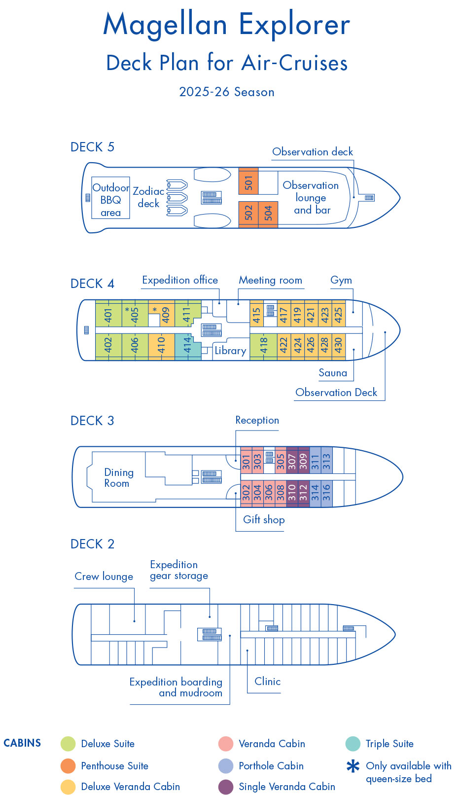 Five different accommodation categories are available to guests. Accommodations are spacious, ranging in size from 40 sq. mt. (440 sq ft) to 20 sq. mt. (220 sq ft.). All suites and most cabins offer a private balcony. Sleeping arrangements can be configured as either one king-size bed or two twin beds, in most cases.